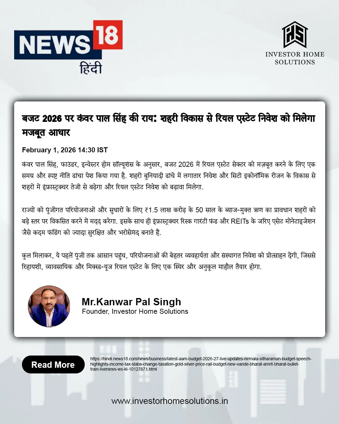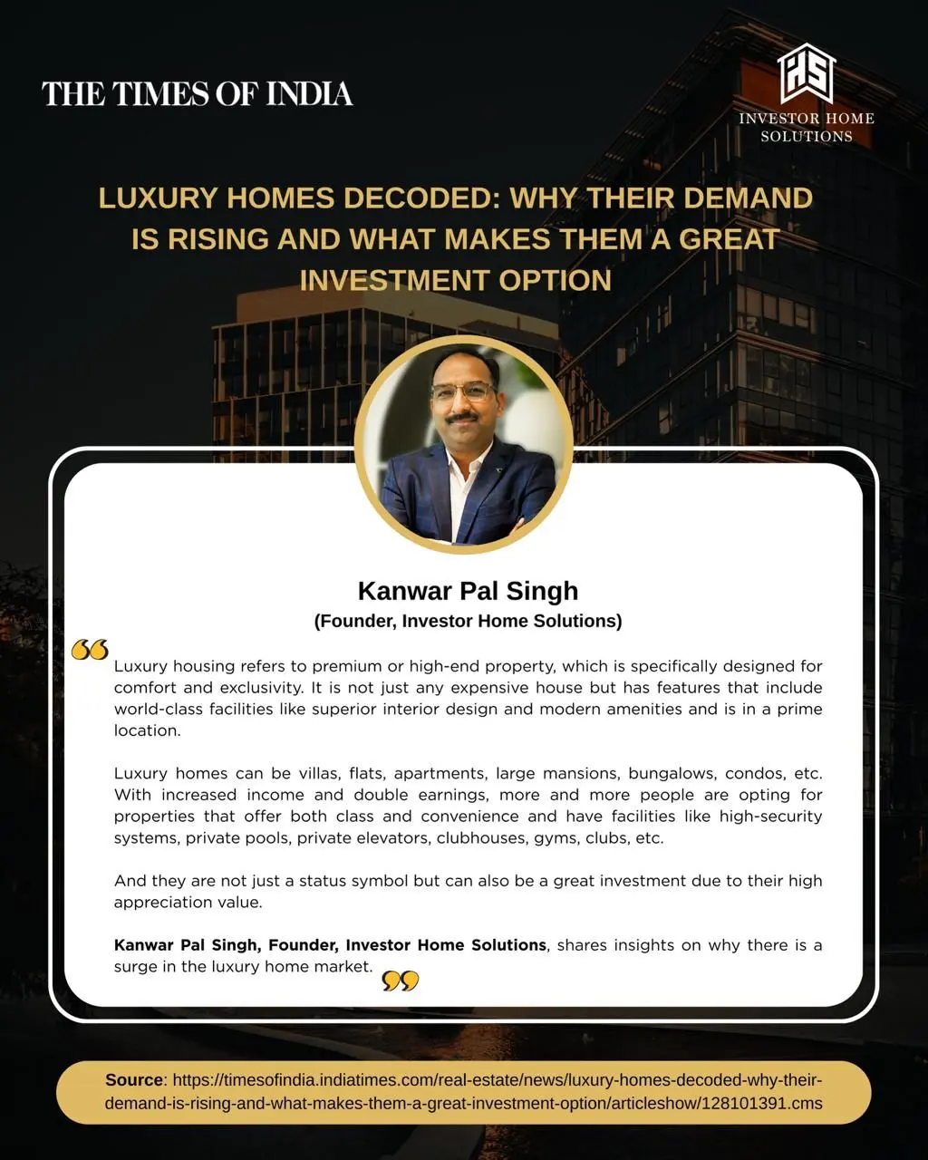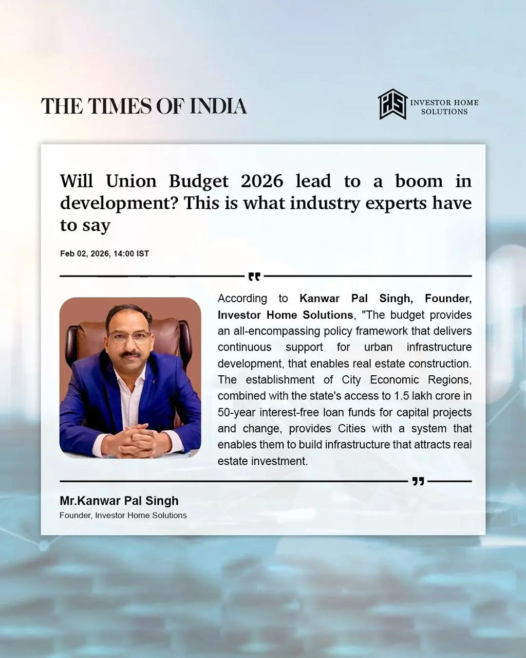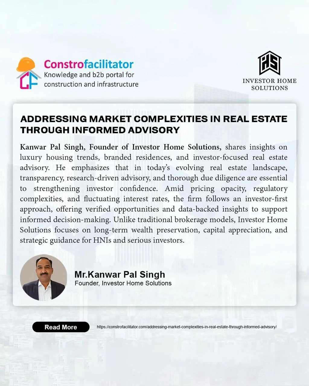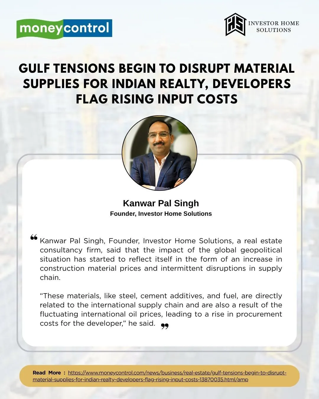 As a trusted voice in the property investment sector, Mr. Kanwar Pal Singh regularly shares expert analysis on market trends, investment strategies, and the evolving Gurgaon real estate landscape. His insights have been featured in leading publications such as Times of India, Hindustan Times, News18, Business Standard, and ANI.